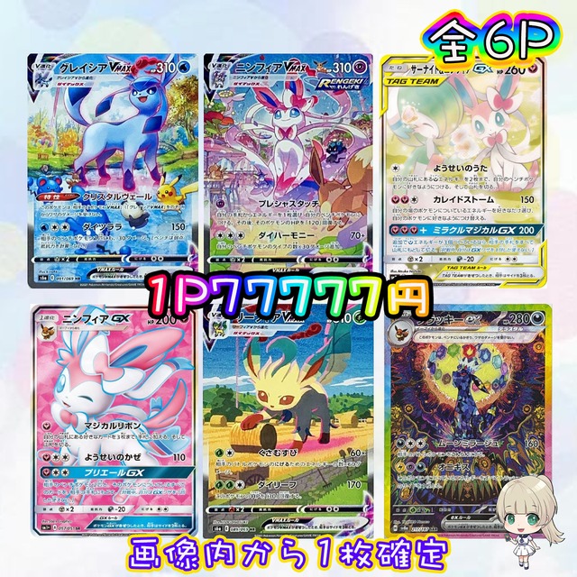 ご覧頂きありがとうございます❤ こちらの商品はweb購入者様専用となります。 https://miracle3696.base.shop ご購入の際はこちらからアクセスお願いいたします! ミラクル公式ガチャ会員登録で500ptプレゼント♡ 是非ご覧になってください! https://www.miracle-gacha.jp/ 口数 ☘ 全6パック 金額 ☘ ¥77777 パック内容 ☘ 画像内から1枚確定 当たりは3口 ニンフィアVMAX(SA)【HR】{093/069} [S6a] サーナイト&ニンフィアGX(SA)【SR】{061/055} [SM9a] グレイシアVMAX(SA)【HR】{091/069} [S6a] ハズレは3口 リーフィアVMAX(SA)【HR】{089/069} [S6a] ニンフィアGX【SR】{057/051} [sm1] ブラッキーex【SAR】{217/187} [SV8a] 購入制限 ☘なし ⚠️注意事項⚠️ ❣画像内確定は画像に記載されているカードから必ず1枚出る仕様です。 全口購入すると必ず画像内の全てのカードが出ます。 ❣送料は商品代金と別途¥280でヤマト運輸のネコポスで発送いたします。 ❣発送は水濡れ、折れなどを対策した上でご入金確認の2-3日後に発送致します。 ❣こちらのパックは性質上当たりもハズレもあります。 ❣できる限り傷の少ない物、無いものを選んでいますが中には初期傷、初期線、白かけのあるカードが封入されている場合もございますのでご了承ください。 ❣郵送事故に関しましては保証致しかねますができる限り発送業者と連携し対応致します、 発送通知があったにも関わらずお品物が届かないお客様は当店までご連絡ください。 ❣クレジットカード不正利用の疑いがある場合はメールにてご連絡またはキャンセルさせていただく場合がございます。 ❣返品交換などはお受け出来ませんので、ご理解いただいた上でのご購入お願いいたしますm(__)m