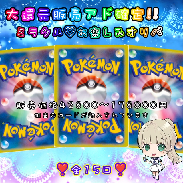 ご覧頂きありがとうございます❤ こちらの商品はweb購入者様専用となります。 https://miracle3696.base.shop ご購入の際はこちらからアクセスお願いいたします! 口数 ☘ 全15パック 金額 ☘ ¥40000 パック内容 ☘ シングルカードが1枚 販売価格42800〜178000(フリマサイト参考)のカードが15口になります! 購入制限 ☘なし ⚠️注意事項⚠️ ❣送料は商品代金と別途¥280でヤマト運輸のネコポスで発送いたします。 ❣発送は水濡れ、折れなどを対策した上でご入金確認の2-3日後に発送致します。 ❣こちらのパックは性質上当たりもハズレもあります。 ❣できる限り傷の少ない物、無いものを選んでいますが中には初期傷、初期線、白かけのあるカードが封入されている場合もございますのでご了承ください。 ❣郵送事故に関しましては保証致しかねますができる限り発送業者と連携し対応致します、 発送通知があったにも関わらずお品物が届かないお客様は当店までご連絡ください。 ❣クレジットカード不正利用の疑いがある場合はメールにてご連絡またはキャンセルさせていただく場合がございます。 ❣返品交換などはお受け出来ませんので、ご理解いただいた上でのご購入お願いいたしますm(__)m
