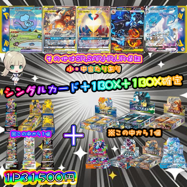 ご覧頂きありがとうございます✨ 注意事項をお読みになってからご購入お願いします❣️ ミラクルガチャリニューアル記念 会員登録で500ptプレゼント♡ 是非ご覧になってください! https://www.miracle-gacha.jp/ 口数 ♣︎77 金額 ♣︎ ¥26800 購入制限 ♣︎ 梱包の都合上1会計につき2つまでになります。 購入後再度購入して頂く事は可能ですが、 送料は1点ずつかかりますので、ご了承ください。。 パック内容 ♣︎ シングルカード1枚 大当たりは5口 ピカチュウ&ゼクロムGX(SA)【SR】{101/095} [sm9] ギラティナV(SA)【SR】{111/100} [S11] ニンフィアVMAX(SA)【HR】{093/069} [S6a] メガリザードンXex【SAR】{110/080} [M2] ブラッキーGX【SSR】{229/150} [sm8b] その他は中当たり、小当たり、SR,SAR,UR,HR保証から72口 ➕下記から1BOX 【ウルトラシャイニー・タッグオールスターズ・25th ANNIVERSARY COLLECTION・シャイニースター・テラスタルフェス】 ➕下記から1BOX 【タッグボルト・蒼空ストリーム・イーブイヒーローズ・ロストアビス・インフェルノX・ブラックボルト・メガシンフォニア】 ❣ BOXのシュリンクは未開封のものになります。 ⚠️注意事項⚠️ ❣送料は商品代金と別途¥280でヤマト運輸の宅急便コンパクトで発送いたします。 ❣発送は水濡れ、折れなどを対策した上でご入金確認の2-3日後に発送致します。 ❣こちらのパックは性質上当たりもハズレもあります。 ❣できる限り傷の少ない物、無いものを選んでいますが中には初期傷、初期線、白かけのあるカードが封入されている場合もございますのでご了承ください。 ❣郵送事故に関しましては保証致しかねますができる限り発送業者と連携し対応致します、 発送通知があったにも関わらずお品物が届かないお客様は当店までご連絡ください。 ❣クレジットカード不正利用の疑いがある場合はメールにてご連絡またはキャンセルさせていただく場合がございます。 ❣返品交換などはお受け出来ませんので、ご理解いただいた上でのご購入お願いいたしますm(__)m