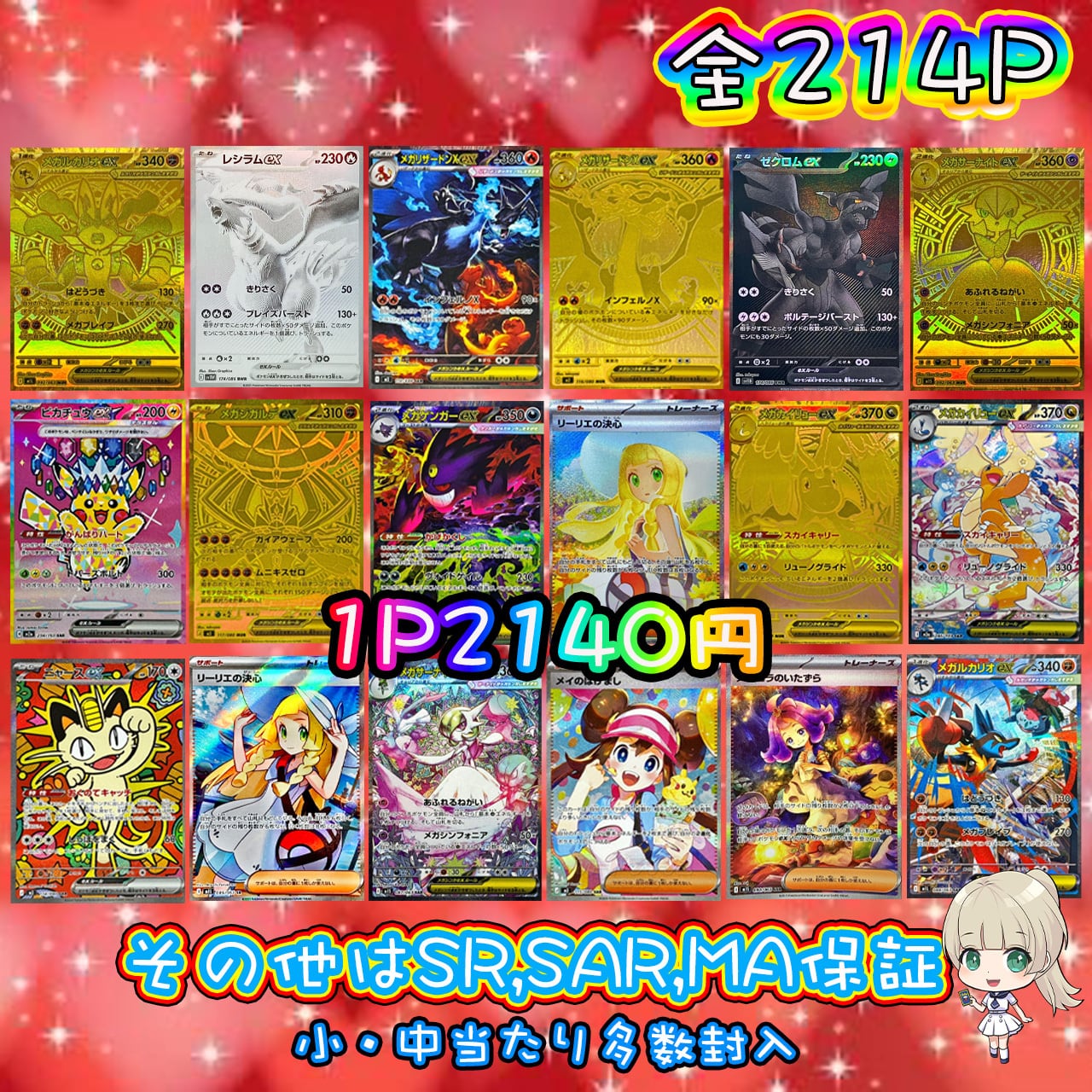メガリザードンXex【MUR】{116/080} [M2]メガリザードンXex【SAR】{110/080} [M2]ゼクロムex【BWR】{174/086} [SV11B]レシラムex【BWR】{174/086} [SV11W]メガルカリオex【MUR】{092/063} [M1L]メガサーナイトex【MUR】{092/063} [M1S]メガゲンガーex【SAR】{240/193} [M2a]ピカチュウex【SAR】{234/193} [M2a]メガカイリューex【MUR】{250/193} [M2a]メガジガルデex【MUR】{117/080} [M3]メガカイリューex【SAR】{246/193} [M2a]リーリエの決心【SAR】{091/063} [M1L]メイのはげまし【SAR】{115/080} [M3]リーリエの決心【SR】{086/063} [M1L]アセロラのいたずら【SAR】{090/063} [M1S]ニャースex【SAR】{114/080} [M3]メガサーナイトex【SAR】{087/063} [M1S]メガルカリオex【SAR】{088/063} [M1L]