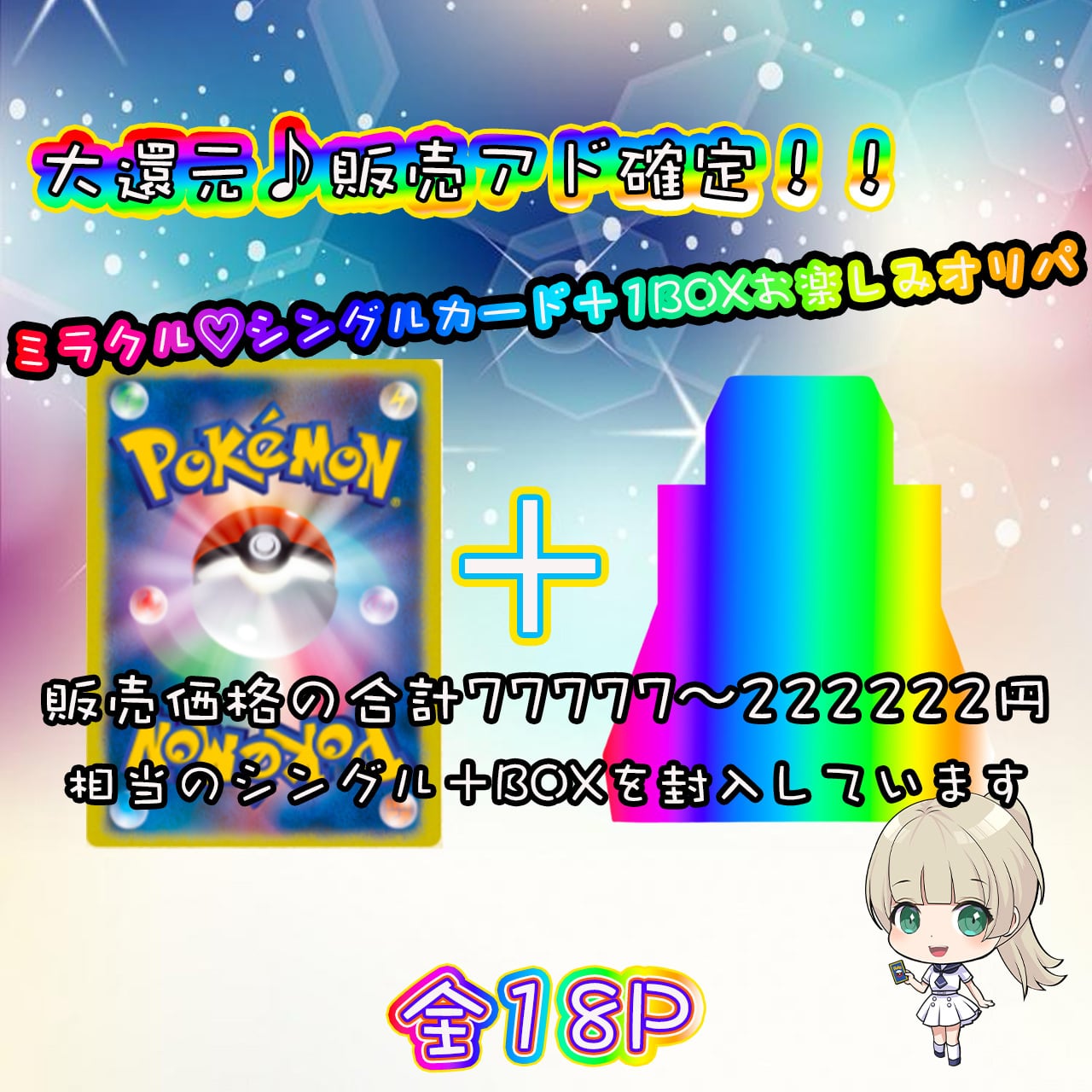 シングルカード+BOXの合計販売価格77777〜222222(大手カードショップ、フリマサイト参考)が18口になります!